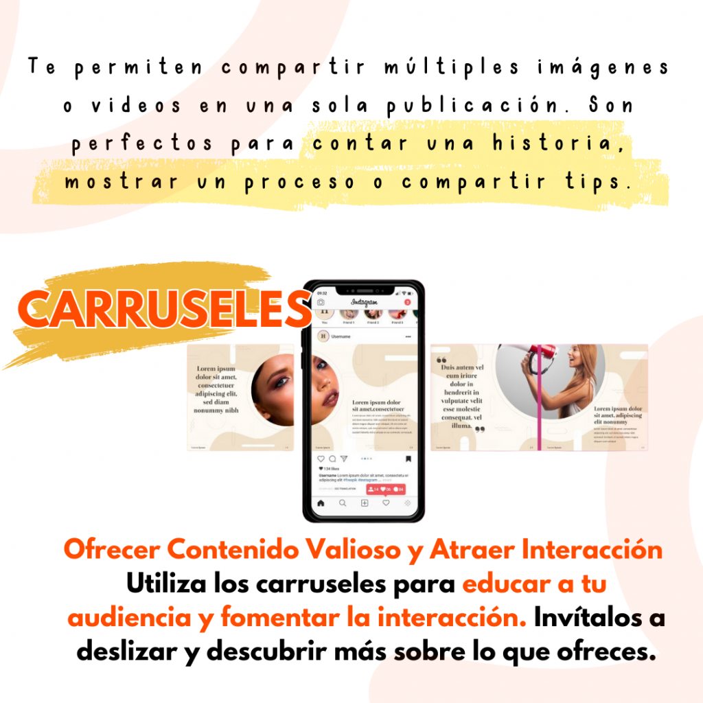 Los carruseles son perfectos para compartir contenido más extenso de una manera atractiva y fácil de consumir. Este formato invita a tu audiencia a deslizar para seguir leyendo, lo que aumenta el tiempo que pasan interactuando con tu contenido.
